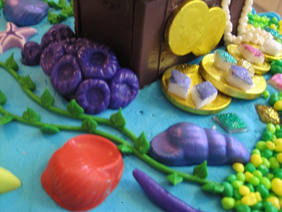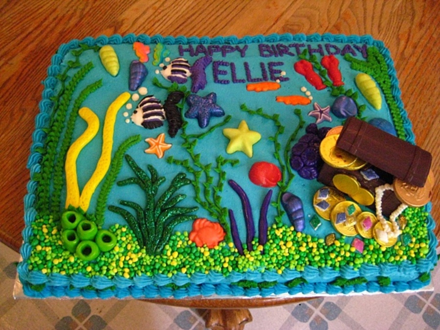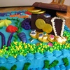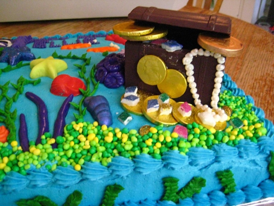 This is an aquarium (or rather the entire ocean!) I just completed for a 12 year old. I used the chocolate chip cookie dough filling from this site, and it was excellent! Chocolate treasure box is completely edible, made from a mold, where I had to put the sides and top on. Took about 12 hours total but it was fun!