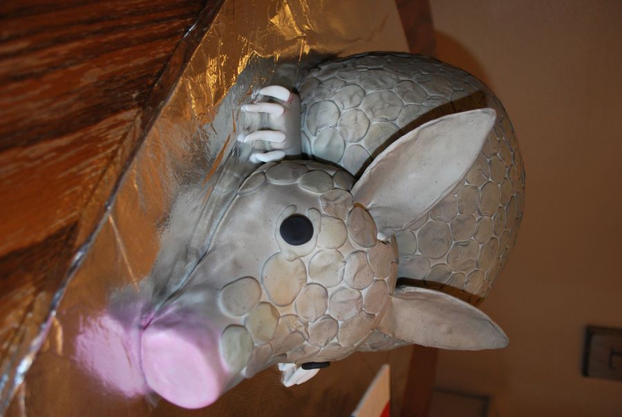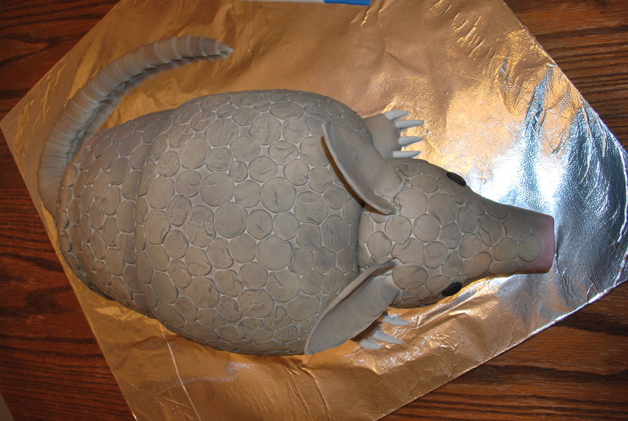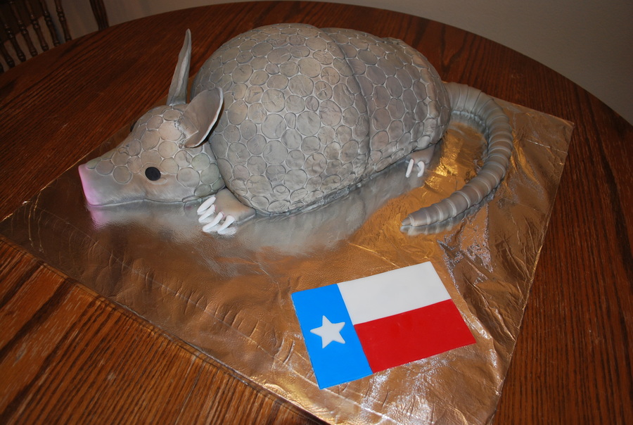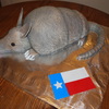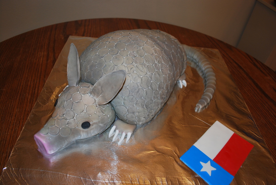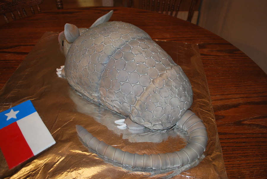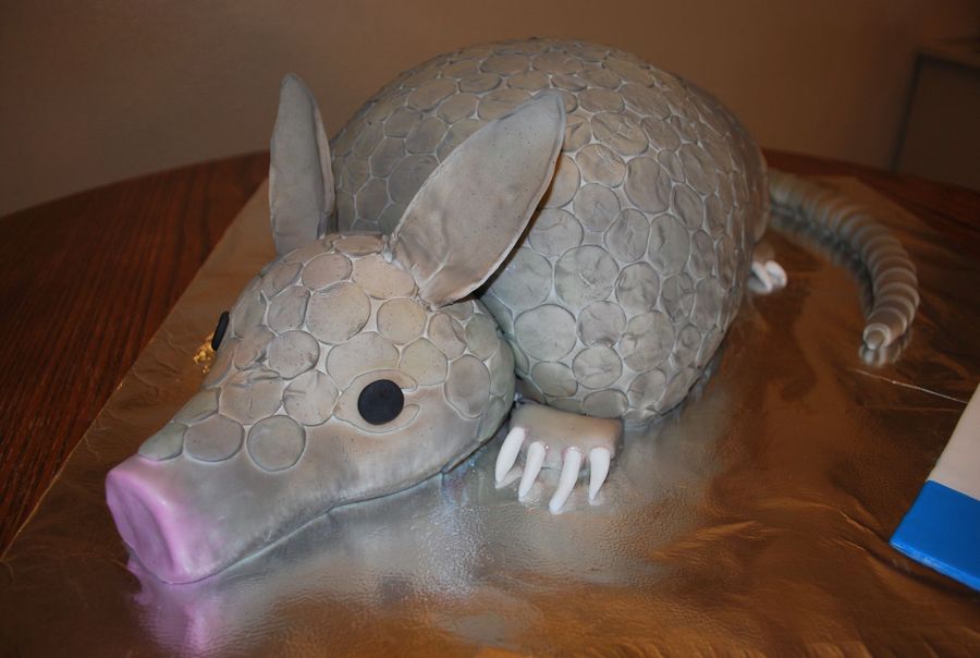 This cake was a groom's cake for a wedding, they wanted a cake shaped like an armadiilo because of the bloody armadillo cake on Steel Magnolias. The cake is covered in fondant with fondant accents. The head was RKT covered in fondant with gumpaste ears. The tail was all fondant with fondant strips. And the inside of the armadillo was red velvet cake with cream cheese buttercream. Thanks for looking!