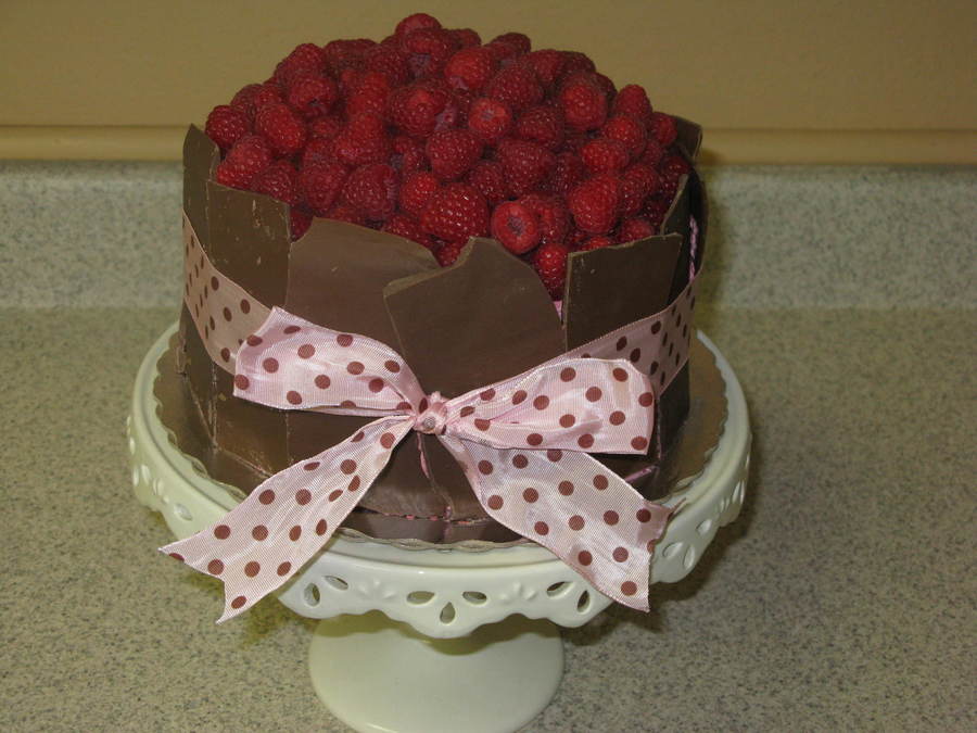 A cake for friends party. White cake with raspberry buttercream. Surrounding by chocolate that was tied on with decorative ribbon and then topped with lots of fresh raspberries.