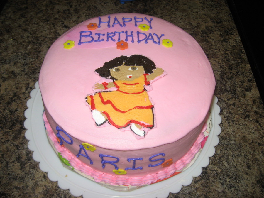 9" three layer butter cream icing, two layers vanilla and middle layer strawberry. Dora, FBCT.