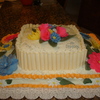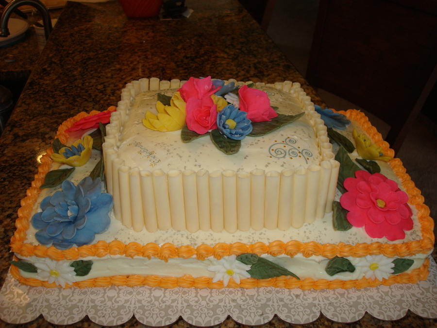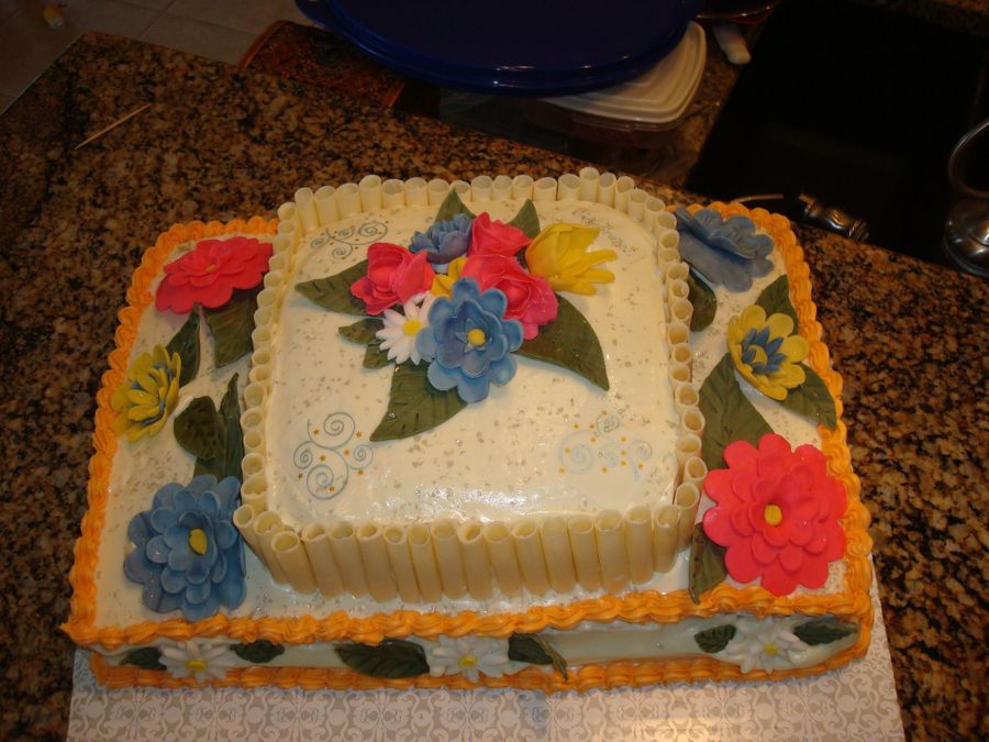 Made with french vanilla cake and white chocolate mousse frosting and fresh strawberries. Fondant flowers and handmade white chocolate rolls
