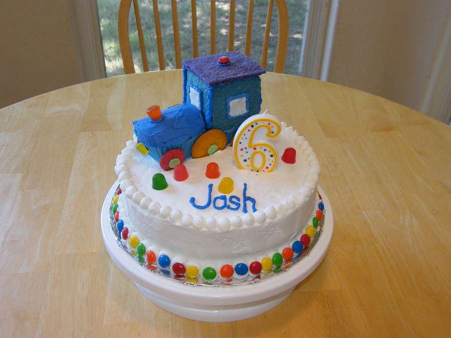 Birthday cake done using the engine design from the Wilton cupcake book on top of a 2 layer 9" round cake. M&M's used to decorate the border.