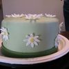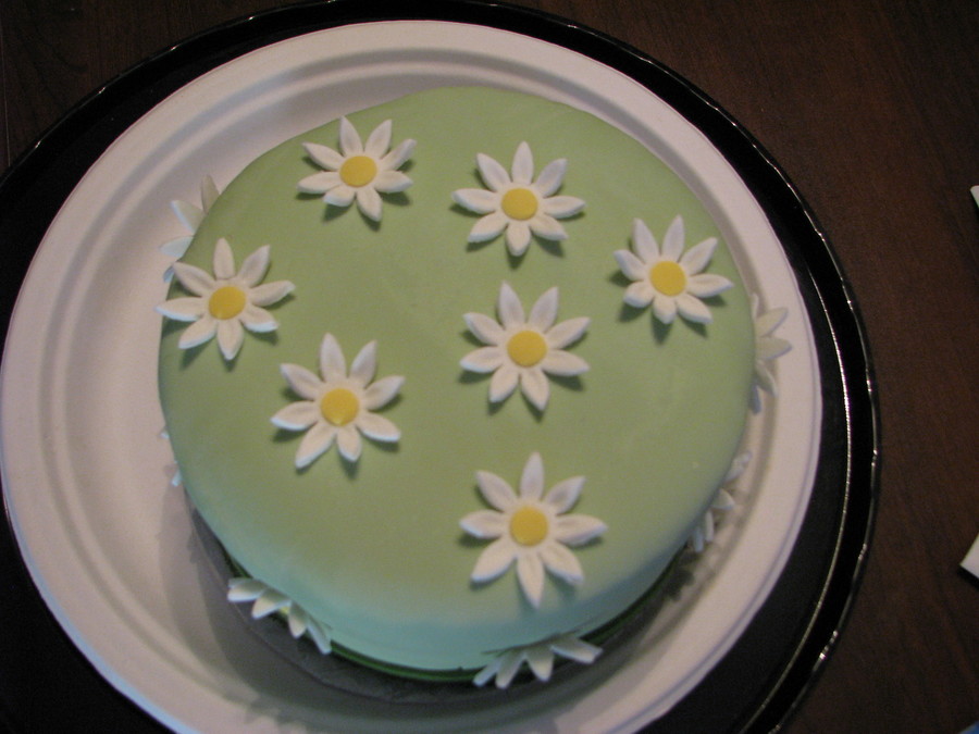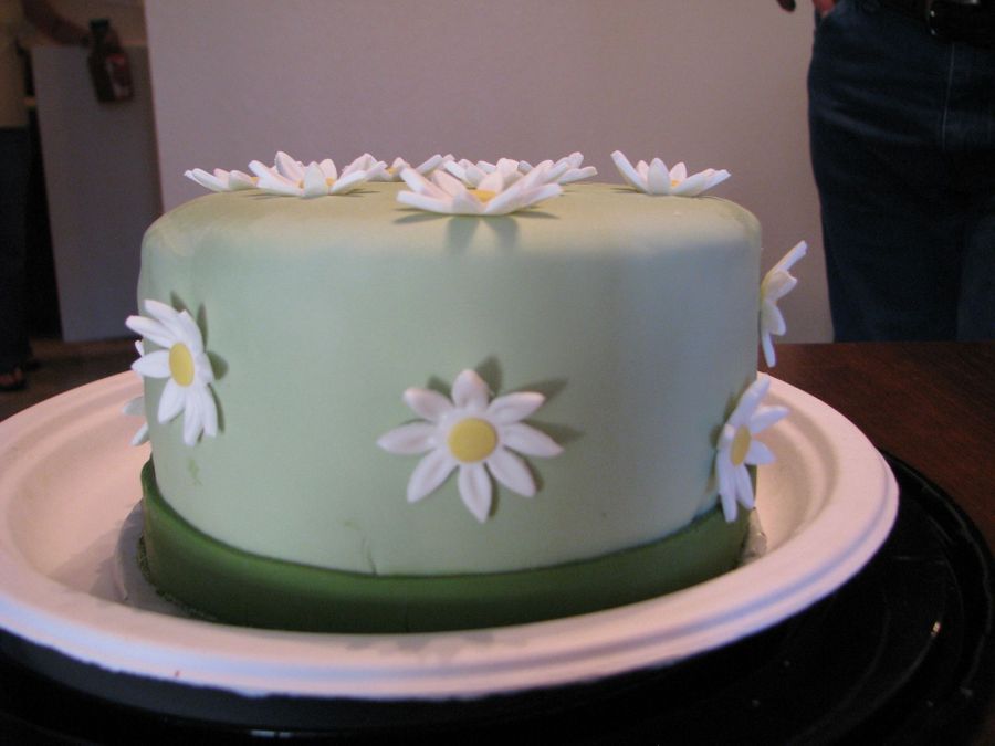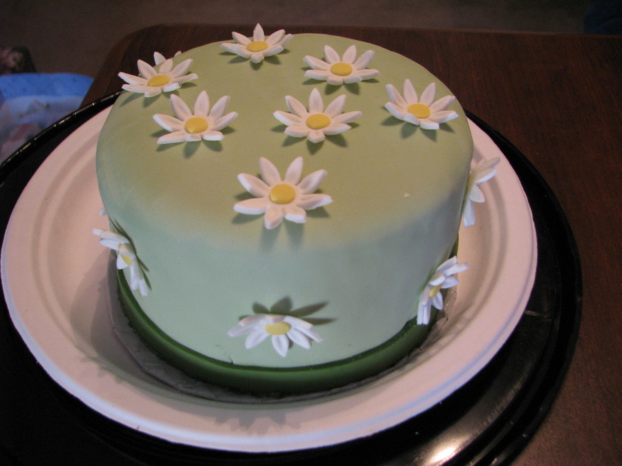 Daisy cake for my sister's birthday. 2 layer 6" round cake covered in fondant with dried fondant daisies.