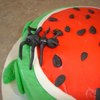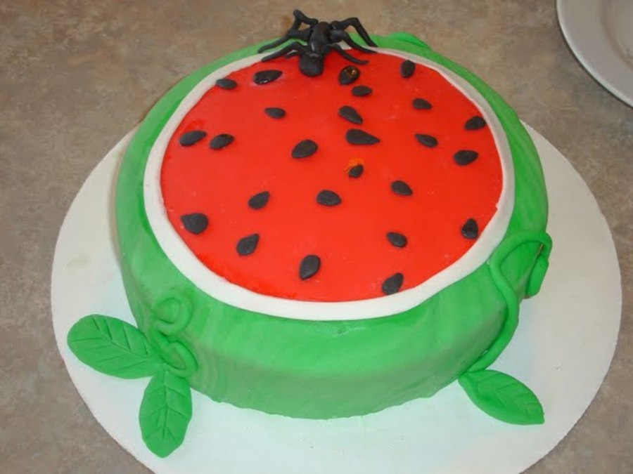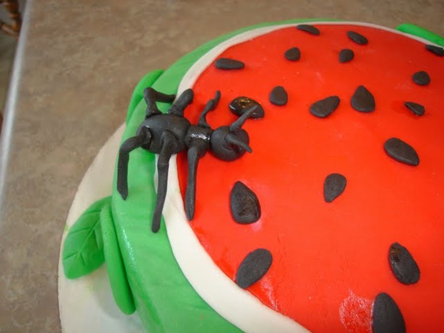watermelon cake i made for a contest and came in 2nd :) cake is covered in fondant. ant made out of fondant also. it was still a little wet when i took the pic.