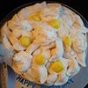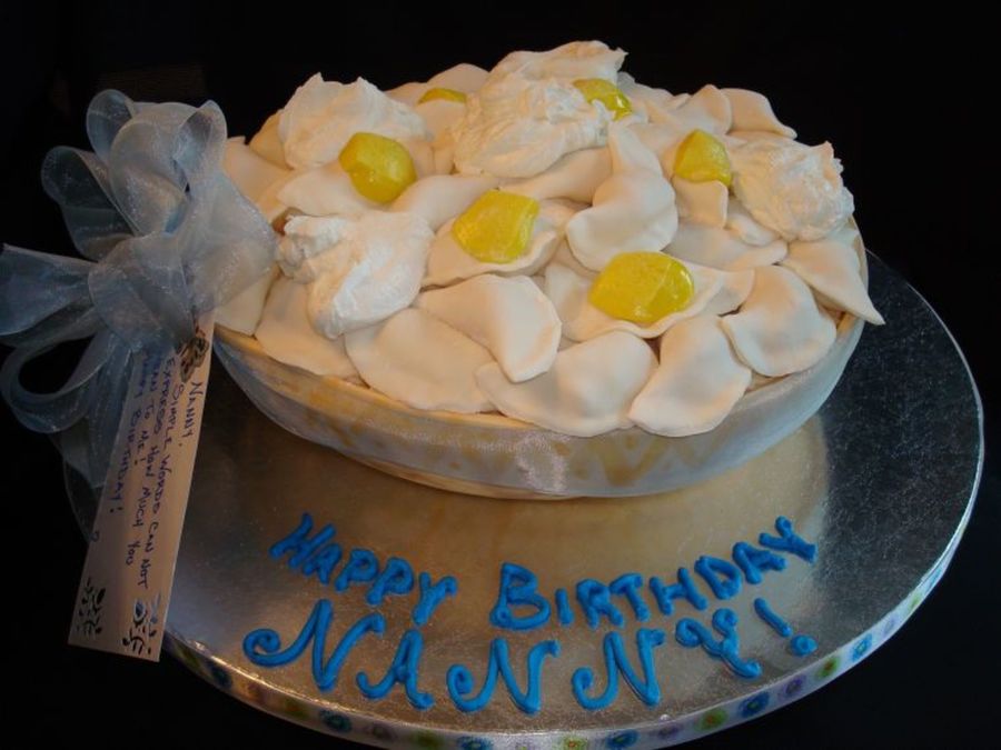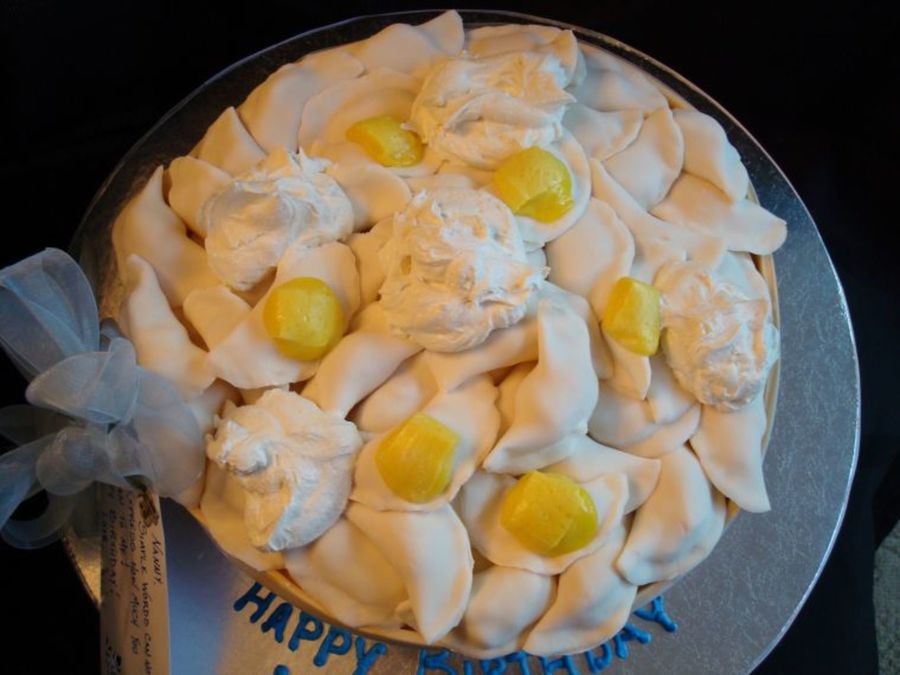 I made this for my Nanny's 85th birthday. She has made 1000's upon 1000's of perogies over the years. Fondant covered bowl cake. Fondant perogies filled with 1/2 mini cupcake and buttercream tinted orange. Buttercream "sourcream" and melted starbust "butterpats".
