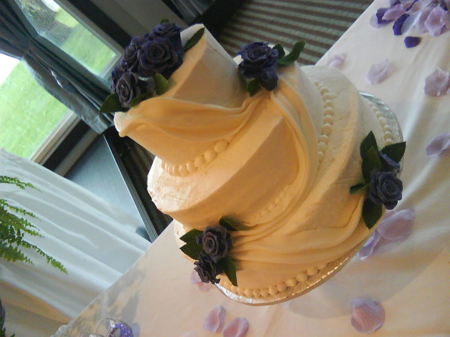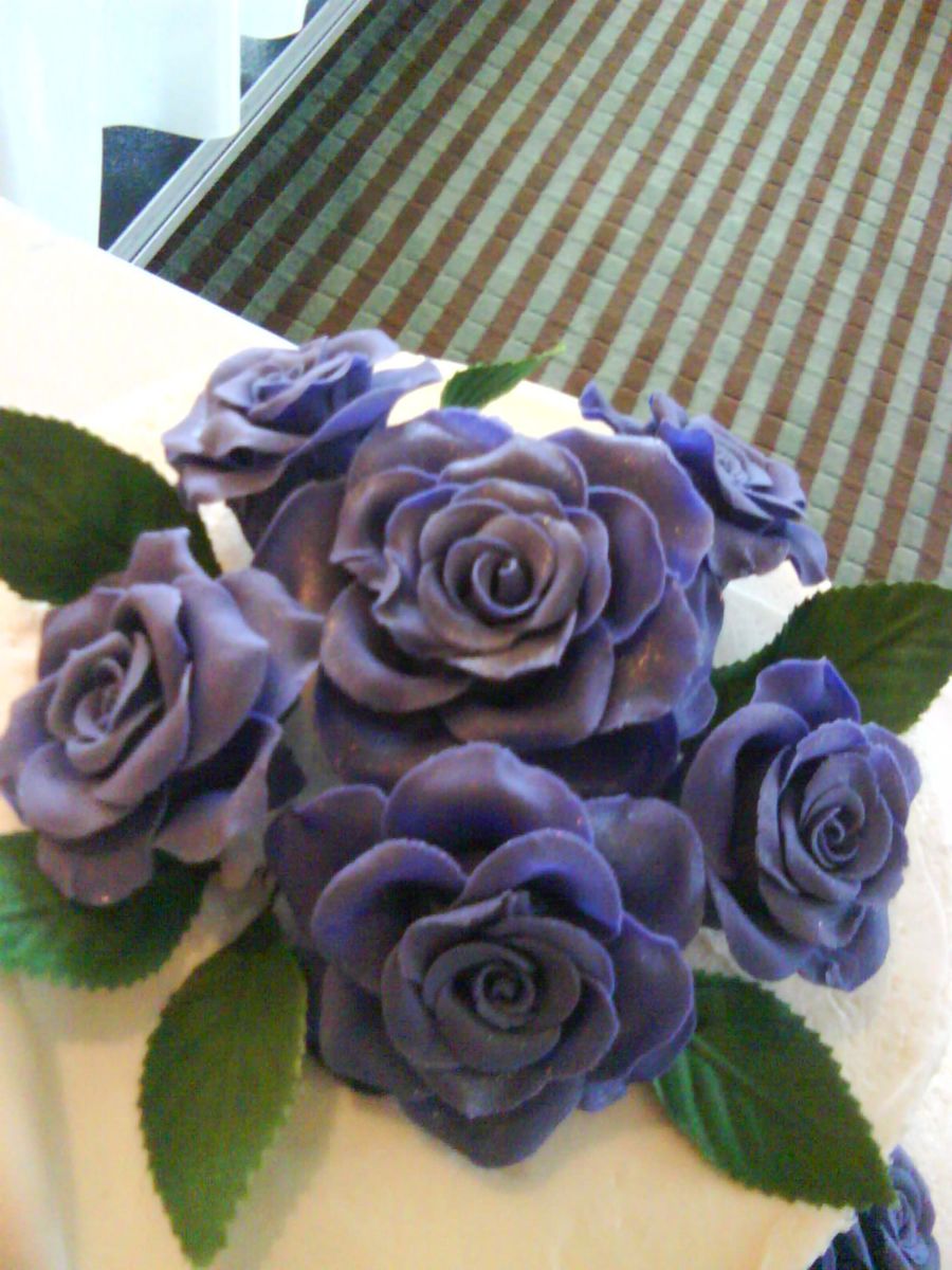 chocolate cake 12" with chocolate icing, 10" with cream filling and 6" with strawberries, gumpaste/fondant roses and drapery-she wanted the flowers larger so i started with a small styrofome ball.