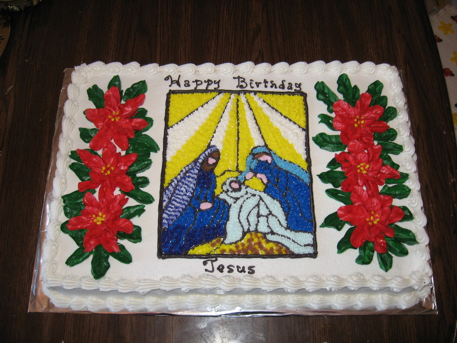 White sheet cake with butter cream frosting Nativity scene with poinsetta flowers on the side
