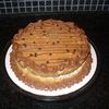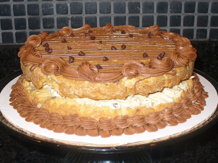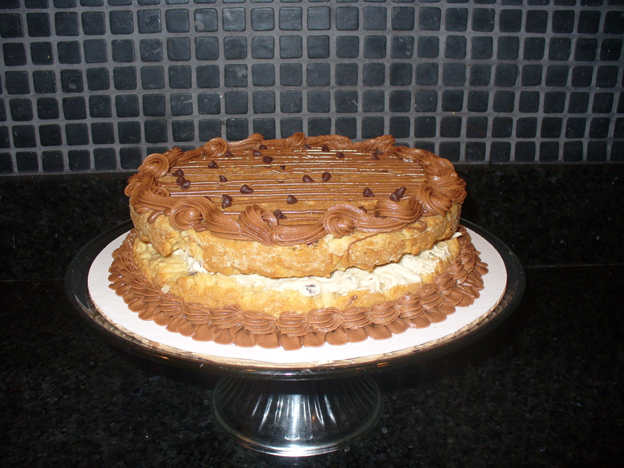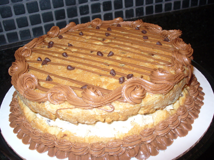 Another 8" chocolate chip cookie cake with eggless chocolate chip cookie dough filling. Drizzled with melted chocolate, topped with mini chips and accented with choclate buttercream.