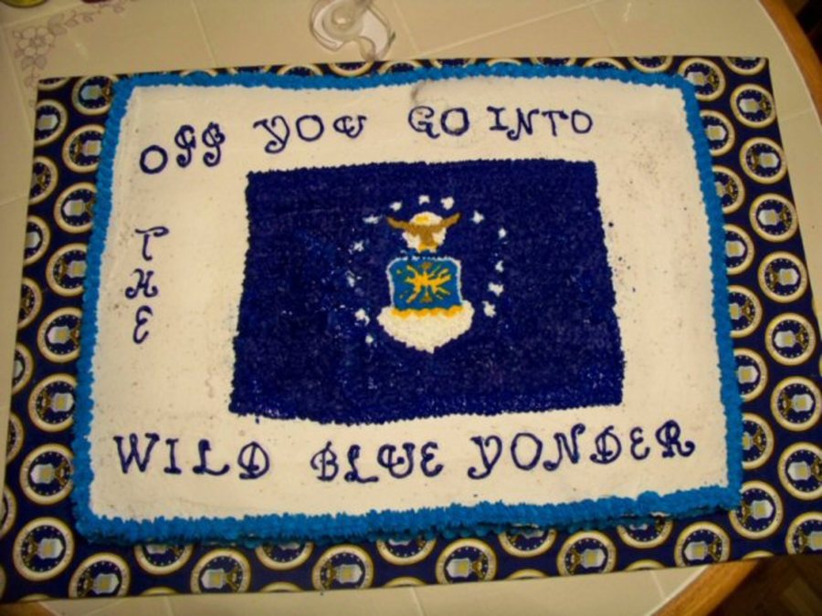 Large sheet cake covered in decorators frosting. The AF Flag is made with Royal icing.