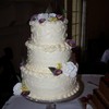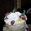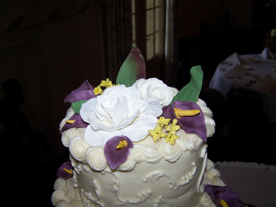It's a miracle because this cake fell over in the box during transport and this much survived.( Thanks to the chef at the venue. He MADE me pull myself together and fix it. ) Originally was 4 tiers with fondant ribbon around the bottom of each tier. It was a nightmare! Gardenias with calla lilies. Boy, did I learn from this one!!