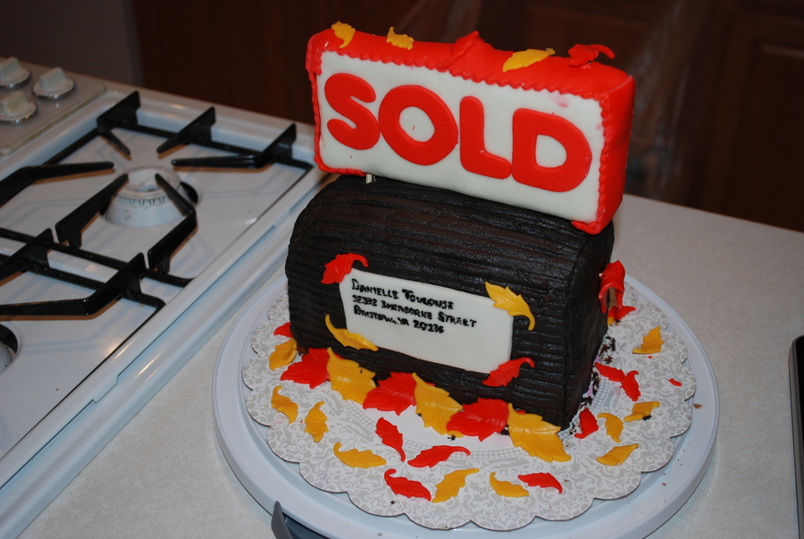 Made this cake for my friend's housewarming party. Marble cake w/ chocolate buttercream icing. Leaves, flag and label are made of MM fondant. Sign is made of cake covered in MM fondant.