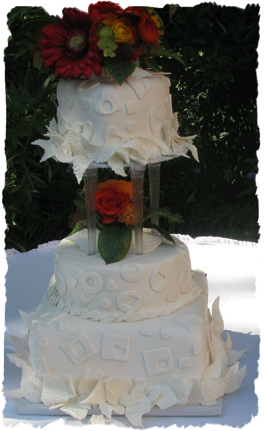 This is my wedding cake that I did in June of 2008, all fondant covered, square bottom, round middle, heart shaped top