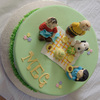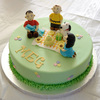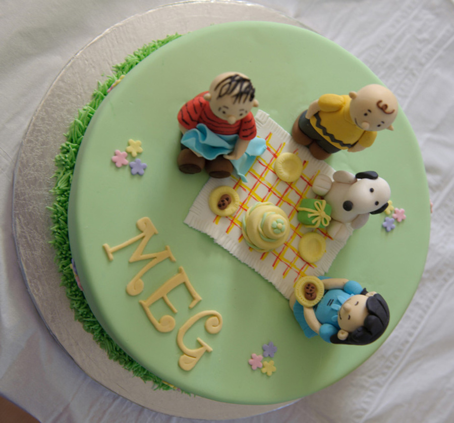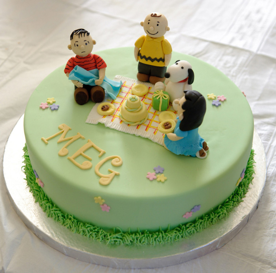Birthday cake with the Peanuts gang. Chocolate cake with caramel filling.