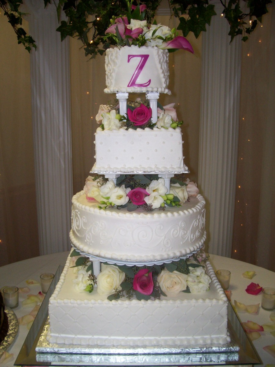 White velvet cake with buttercream. Fresh flowers between the layers and the monogram is an edible image.