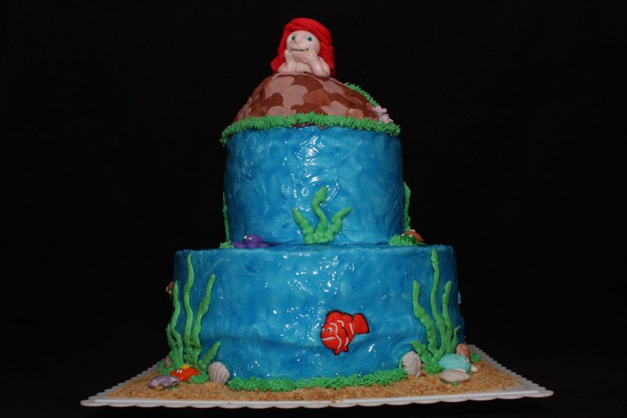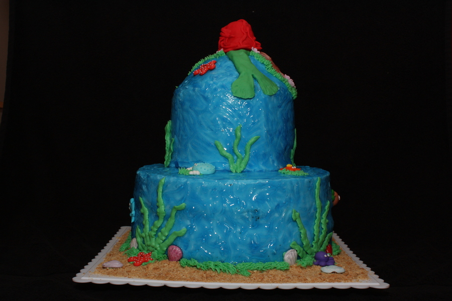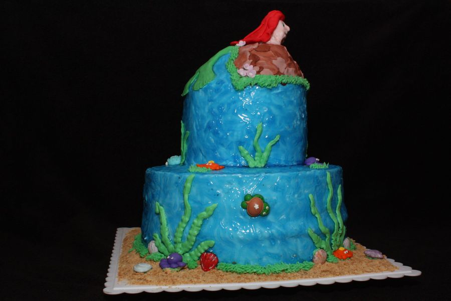 Mermaid cake made for my niece's birthday. 6" and 10" cakes covered in buttercream icing. Used tinted piping gel to get the water look. Royal icing sea creatures, fondant mermaid and stone on top. Crushed graham crackers were used for the sand.
