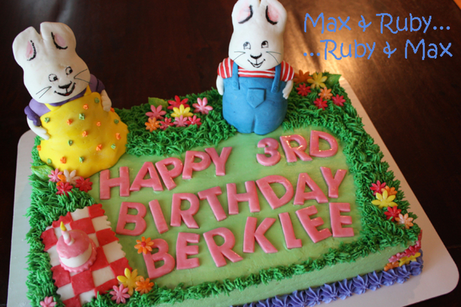 1/3 sheet cake. Max and Ruby made and hand sculpted from rice krispy treats and covered with fondant....All decorations fondant.