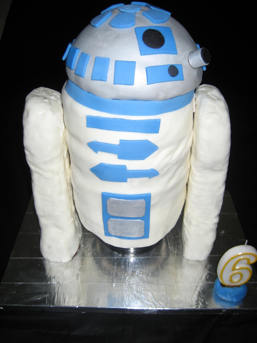 My R2D2 cake that I planned for well over a month for my son's 6th birthday party. It definitely was a labor of love, as it was a big PITA to assemble. My buttercream melted and my fondant bulged, causing me to do it over. In the end, it wasn't as clean as I had envisioned, but it was a HUGE success with kids and parents, it tasted awesome, and, most importantly, it stayed standing throughout the entire car ride and outside party!