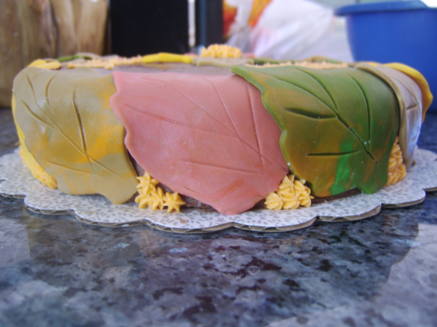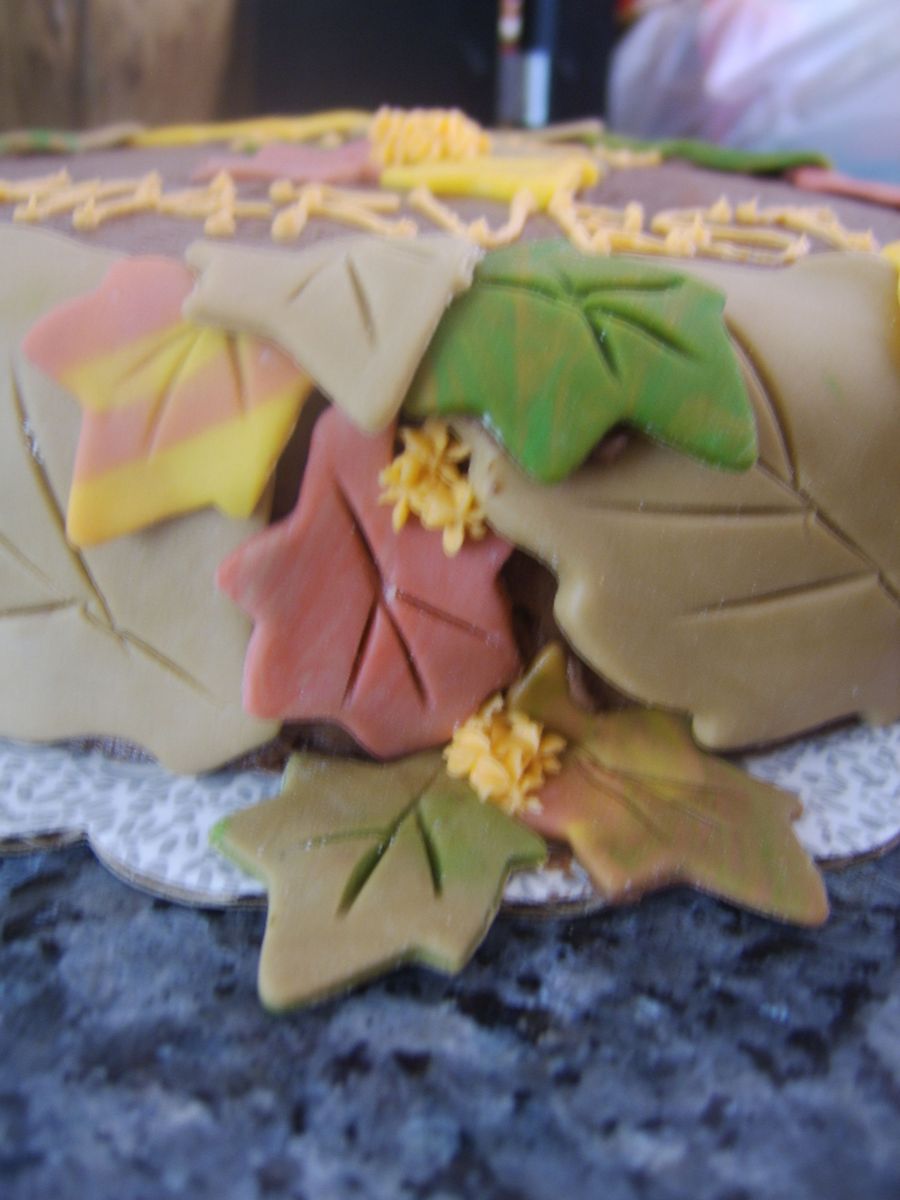 Cake made for a harvest festival for my daughters school. Chocolate cake and chocolate buttercream frosting. Fondent leaves.