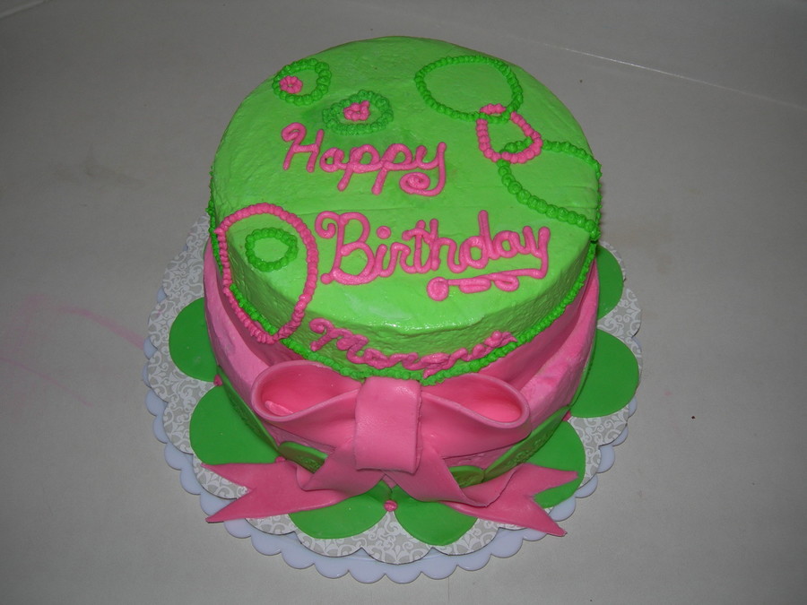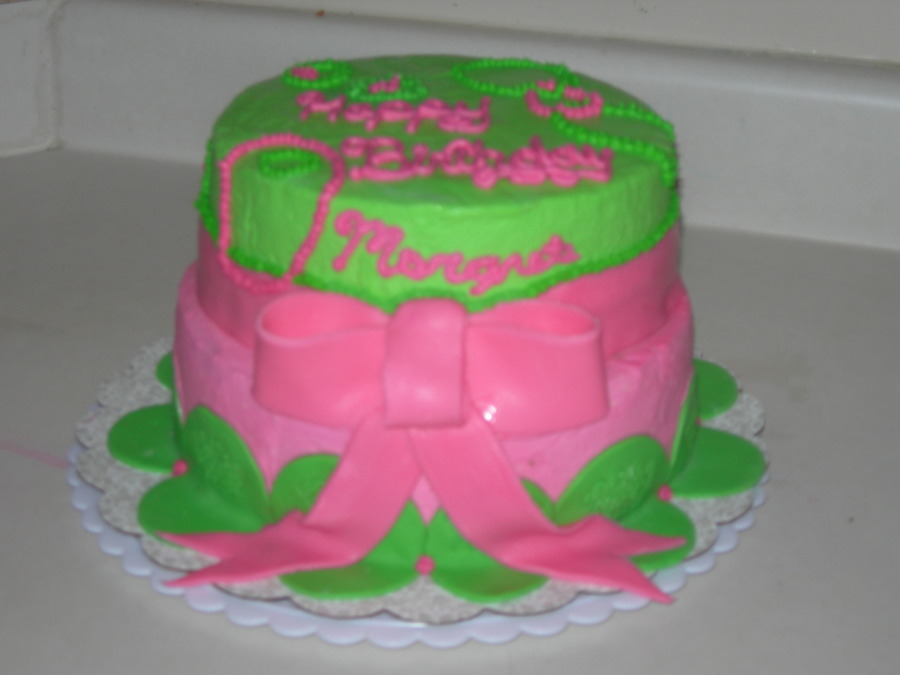 My cousin is an AKA (Alpha Kappa Alpha) and she wanted a green and pink cake. Still learning how to do bows. I am open to any ideas or suggestion.