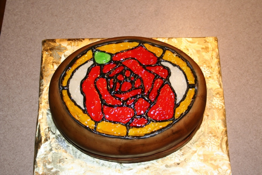 LOVE this technique! It has such a dramatic out come. Fondant "frame", RI piping for the seams and colored piping gel for the glass.