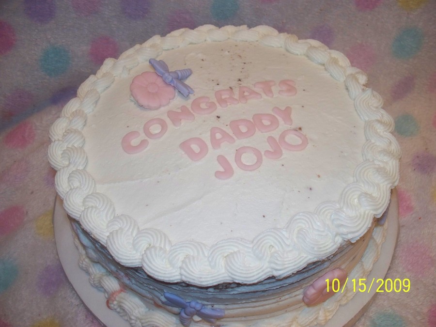 A cake for my brothe in law he is a new dad he wanted chocolate and chocolate frosting so I did marble cake and a white chocolate frosting, all decorations are fondant. I had a little trouble when I was putting the desgin in the sides I think I had the frosting a little to thin