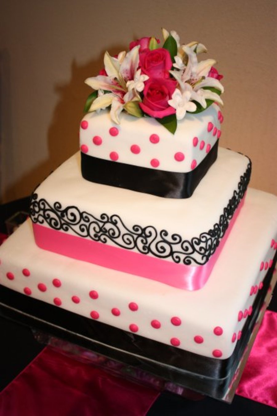 Fondant square cake with hot pink and black detail.