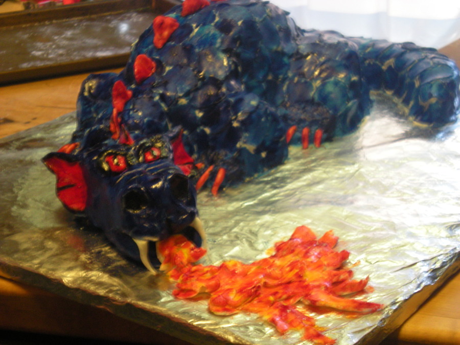 The head is molded from fondant . The rest of the body is cake. I used 3 8' round cakes, I cut one in half, stacked the halves and stood it up for the body. The next one was cut into slightly uneven quarters and used to make the front and hind legs. The third was cut to shape the neck and tail. All the scales were individually cut from thin fondant and applied one by one. Then whole thing was painted with Wilton colors and lemon juice. It took quite awhile but my nephew loved it.