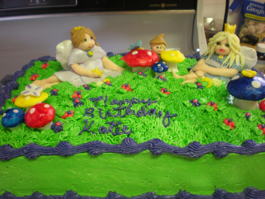 My first Fairy cake, the fairies, mushrooms and elf are all fondant. I used butter cream for the rest of the cake.