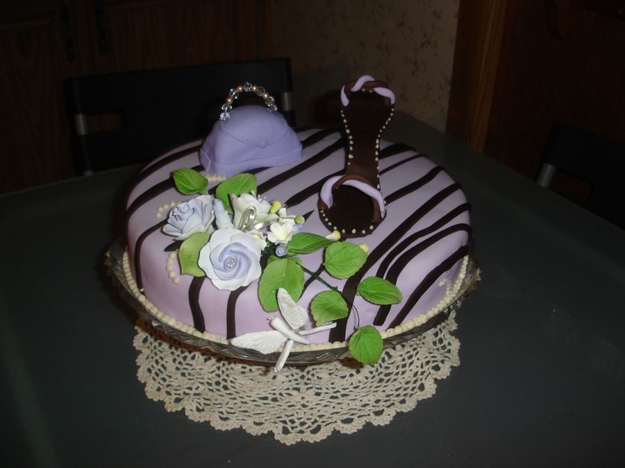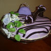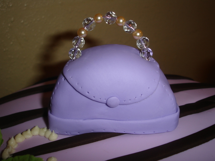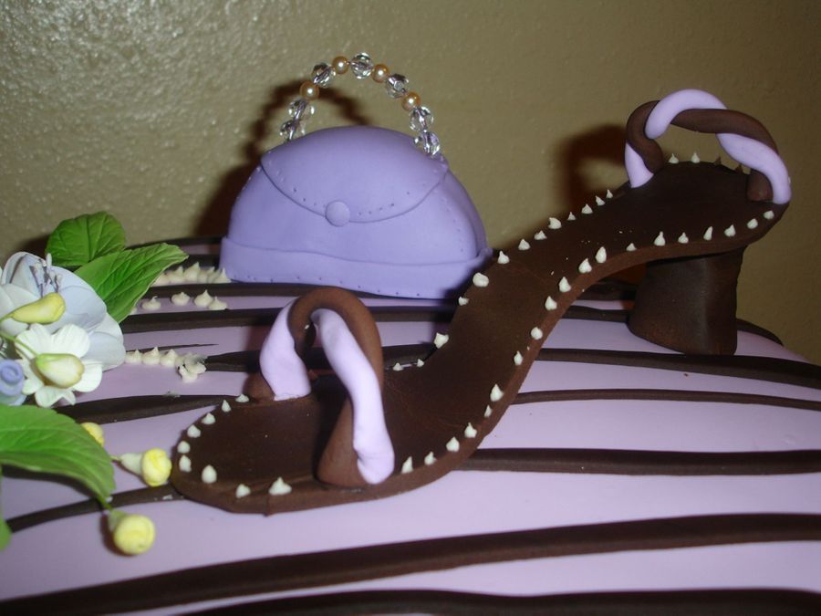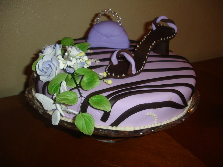 Cake in fondant and zebra patterns, shoe and purse.