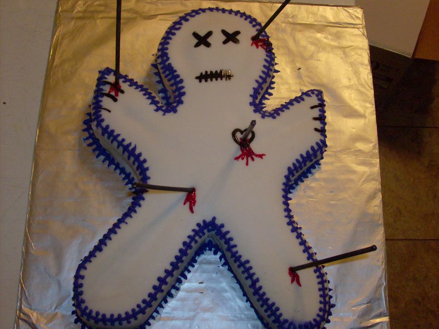 vanilla cake with strawberry "tunnels" that bled when it was cut. frosted with vanilla bc and covered in white fondant. stitches piped on with purple tinted bc. eyes, mouth, heart, and fingers painted with black food coloring. bamboo skewers for the pins. and red tinted piping gel for the blood. TFL!