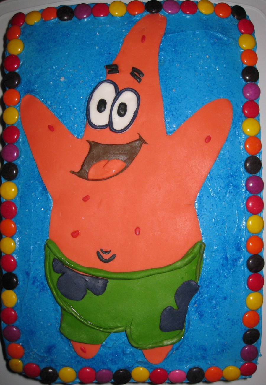 My boyfriend's nephew wanted a patrick cake for his birthday. This is a two tier chocolate cake with chocolat filling. Patrick is created in fondant and I used smarties for the border. I sprinkled the blue buttercream icing in blue and white sugar crystals sparkles.