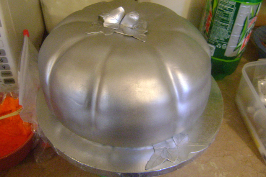 One of three pumpkins for a fall themed wedding. Hummingbird cake covered in fondant and painted silver.