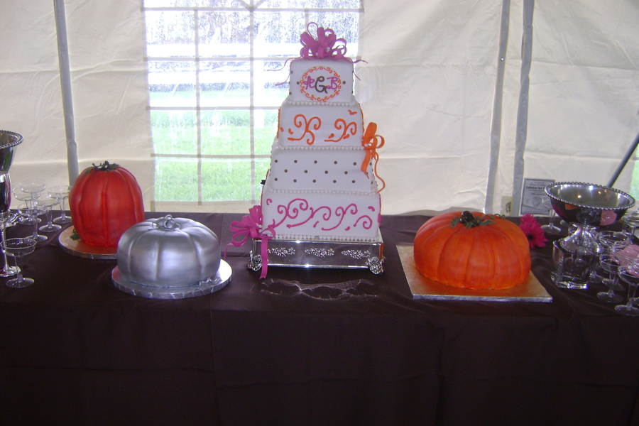 four tiered brides cake, white and chocolate tiers. Pink & orange scrolls and chocolate dots. Three pumpkin grooms cakes; lemon, hummingbird and pumpkin cake. Carved, covered in fondant and painted. Silver one lokes like it's a silver plated figure, came out really cool.