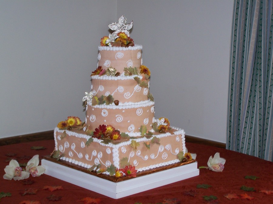 Bottom tier vanilla caramel, next up triple chocolate, then zebra cake, top is pumpkin spice. All frosted with Sugarshack's recipe. Real mums, fondant leaves and acorns.