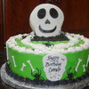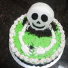 this cake was made for a kids birthday ...the party theme was skeletons. Iced in buttercream. skeleton face is a 6 in chocolate cake carved to shape & fondant used for front of the face as well as the skull shapes around the sides of the cake. royal icing bones, & plastic spider rings for added decoration.