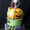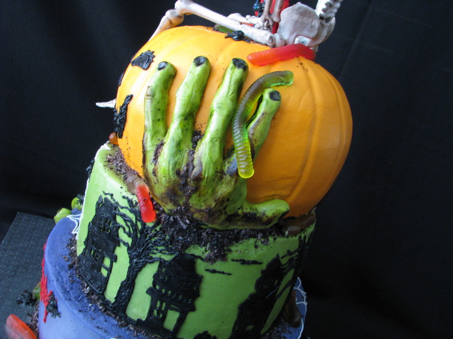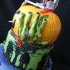 Birthday for a 4 year old who likes scary things...it was a little too scary for me considering his age but it was a lot of fun to do! This is nothing like my usual work so that was cool! BC finish with 1/2 fondant/gumpaste zombie hands, gummy worms, purchased the skeleton.