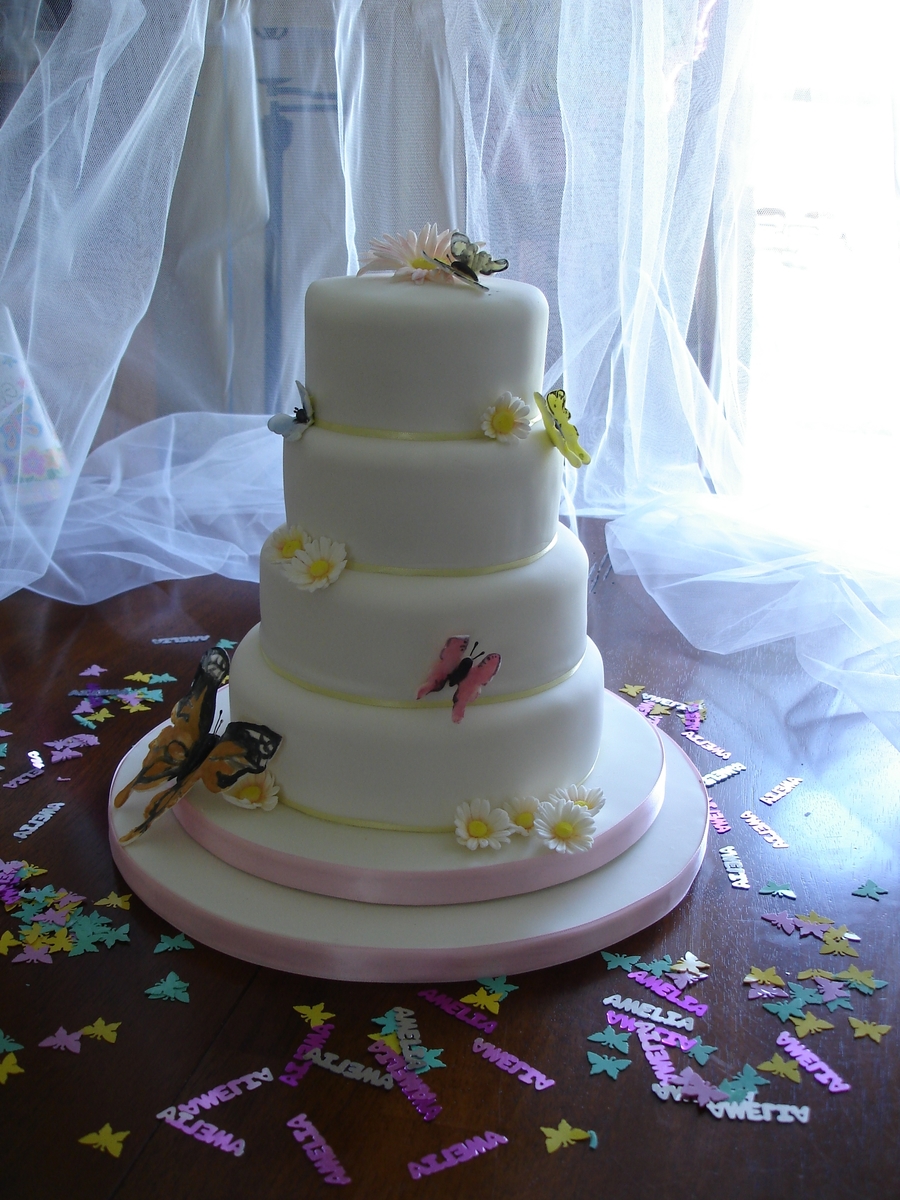 This cake was for my daughers 4th birthday, but it can actually be made for any occasion. The butterflies were made from mexican modelling paste/gum paste and the flowers from sugar florist paste. It is actually smaller than it looks. I made a 4", 5", 6" and 7" cakes which were all decorated in sugarpaste/rolled fondant.