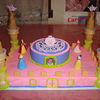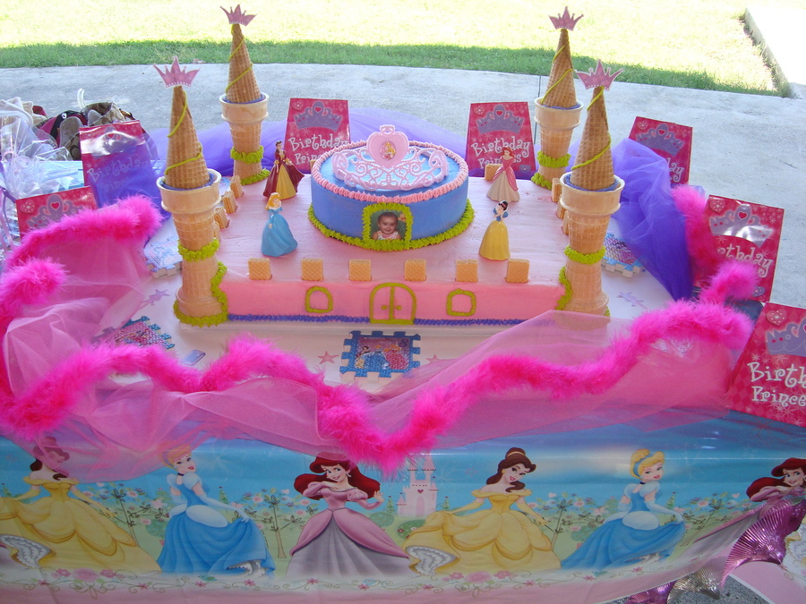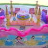 Princess cake. 12X18 sheet cake pan and 8 in. round cake pan on top. Ice cream cones on corners constructed with BC icing. Tiara and 4 Princess figurines are not edible. Hit me with a comment or smiley, please. TFL.