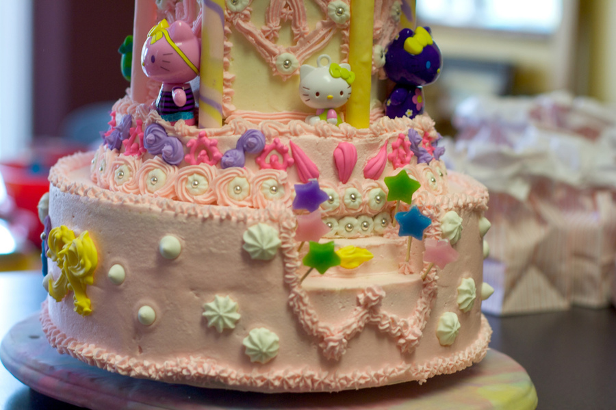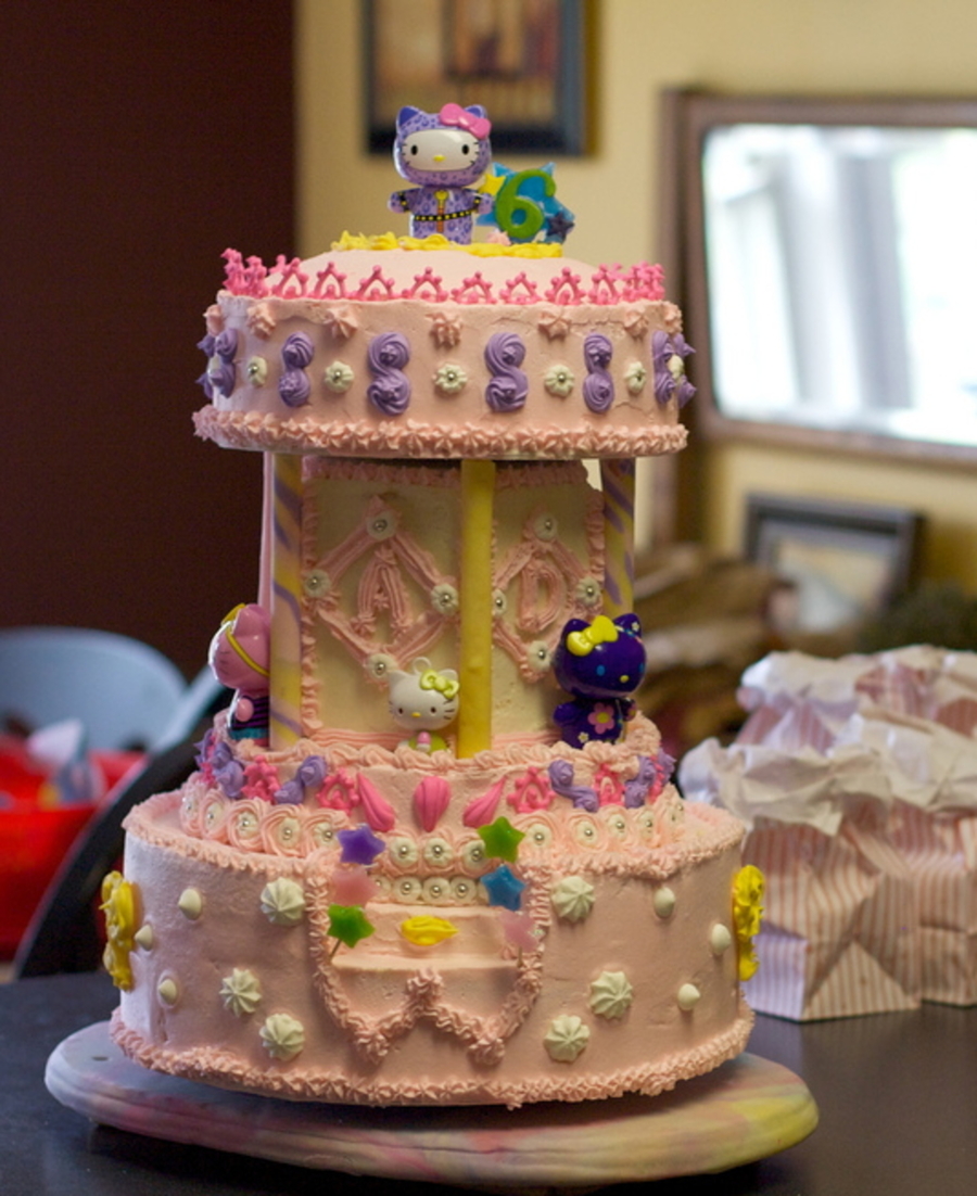 This is a "Hello Kitty Carousel" cake I made for a little girl's sixth birthday...her party theme was Carnival Time... the bottom 3 layers are white almond sour cream cake with strawberry butter cream filling (see my recipe for that on CC), while the middle section and the top of the carousel is made from chocolate and chocolate butter cream filling. The Hello Kitty's are the birthday girl's toys, but the decorations are royal icing and fondant/gum paste (with a few dragee's added in for sparkle). All butter cream exterior. The carousel cake turns on a fondant-covered lazy Susan contraption I put together.