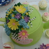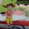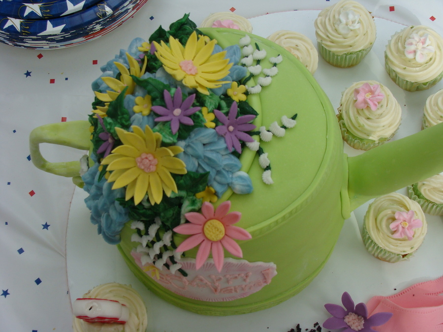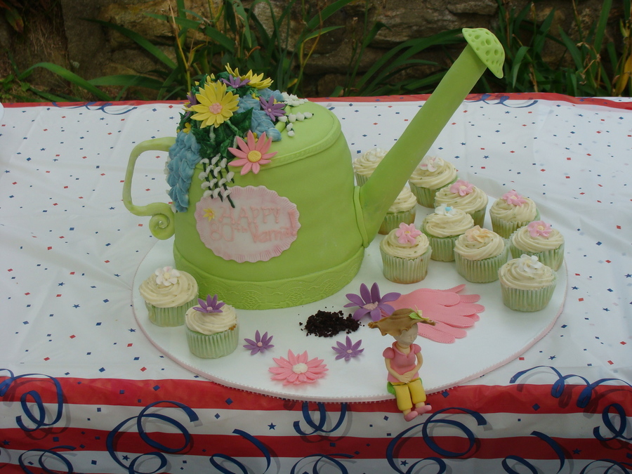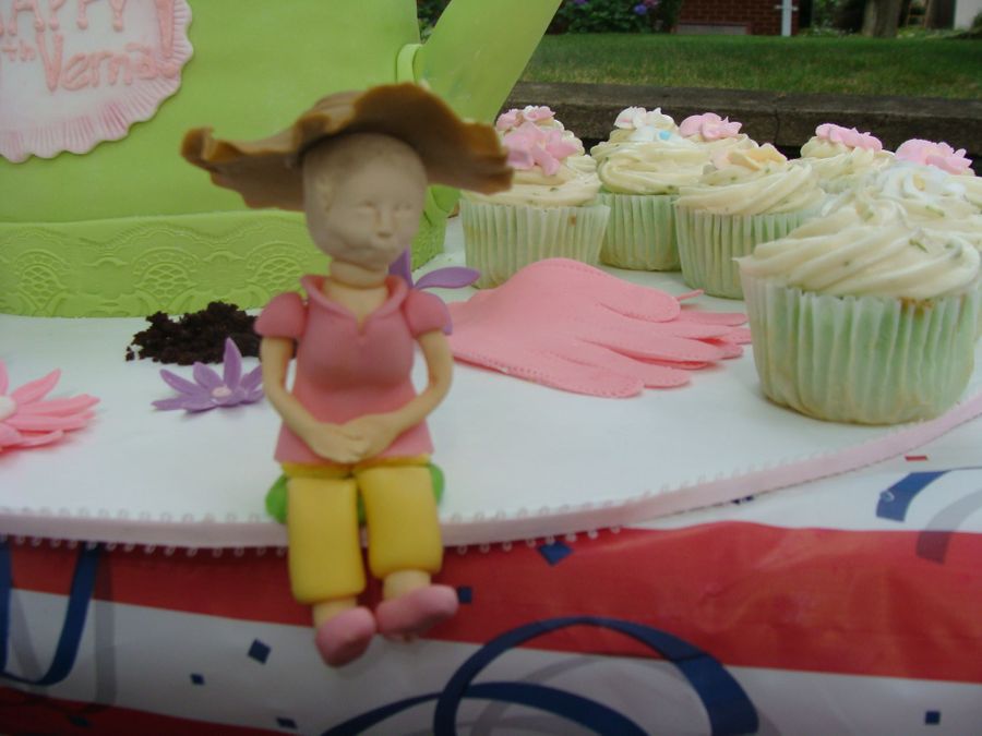 This was for an 80th birthday. She has a green thumb and loves to garden. The cake is pound with choc chip filling and the top is chocolate black froest. The cupcakes were key lime with cream cheese lime frosting. The persons legs broke during transport. I tried to put her in bubble wrap and will not do that again. She would have been better-off on the cake. I had to use fondant to stick her to the cake and hold her legs on.