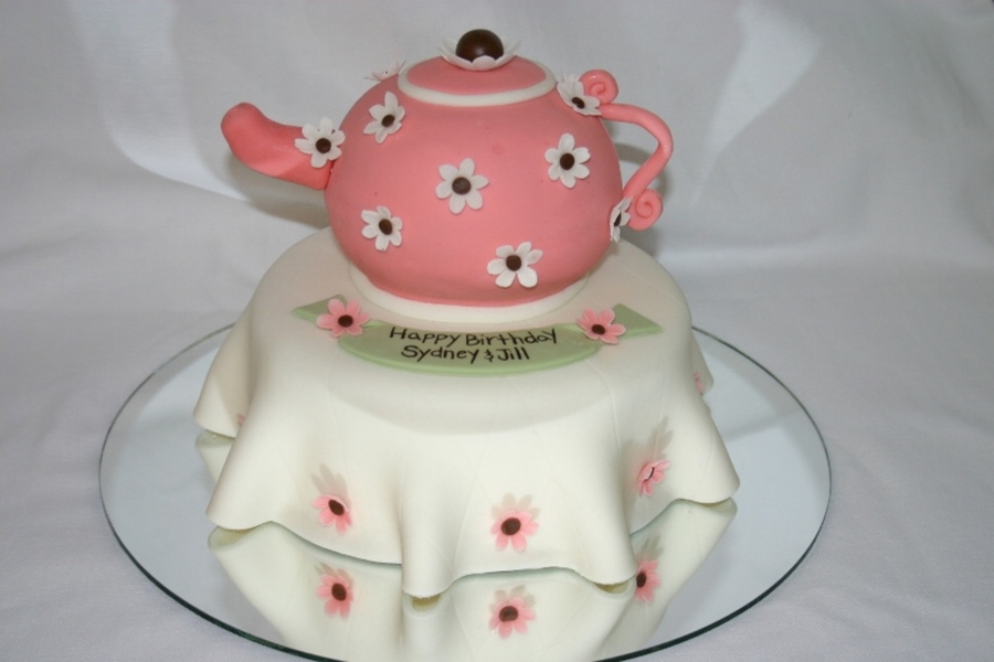 Vanilla cake covered in MMF. Spout, handle, and flowers all gum Paste. Tea Pot made from baking cake in 2 round bowls and then put together.
