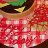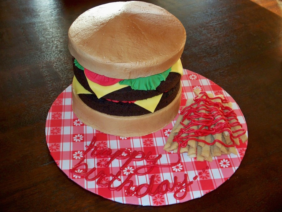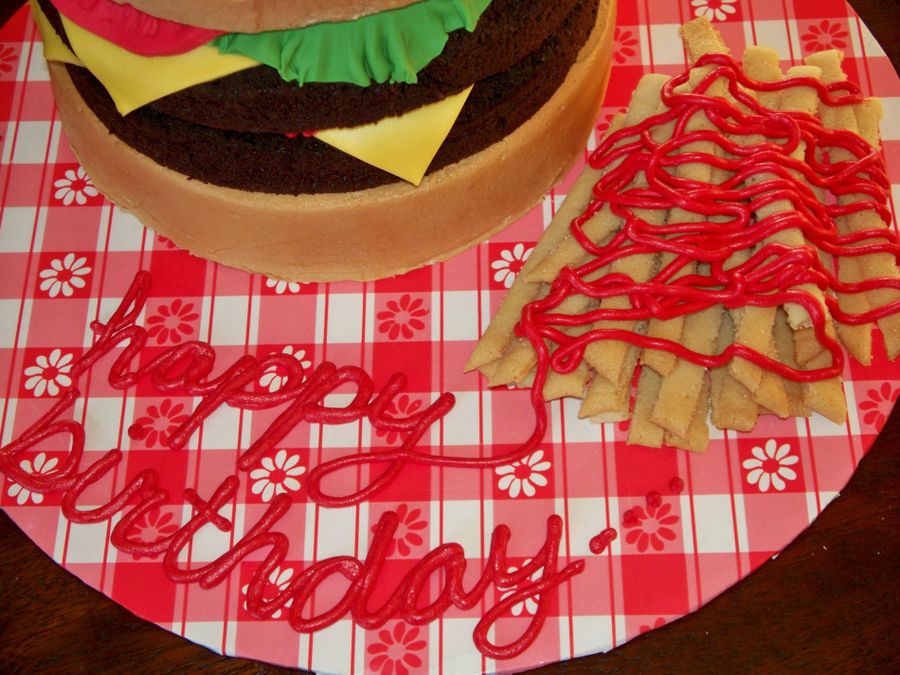 Cake for my hubby's bday. The first cake I have done since I had my baby, sure was a lot easier pre-baby! Buttercream on the buns and fondant lettuce, cheese and tomato. Sugar cookie fries.