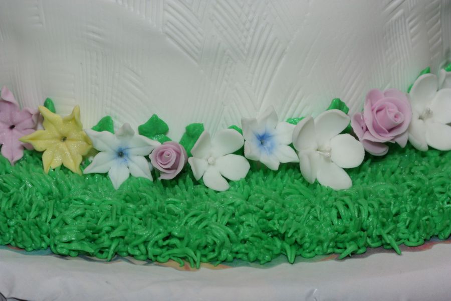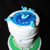 Bird bath cake i did for my grandmother's 80th birthday. She loves blue birds and flowers. 6", 8", & 10" cakes used covered in fondant. Blue piping gel on top to create the water effect. Hand make gumpaste flowers around the base. My DH made a wonderful base to support all the tiers.