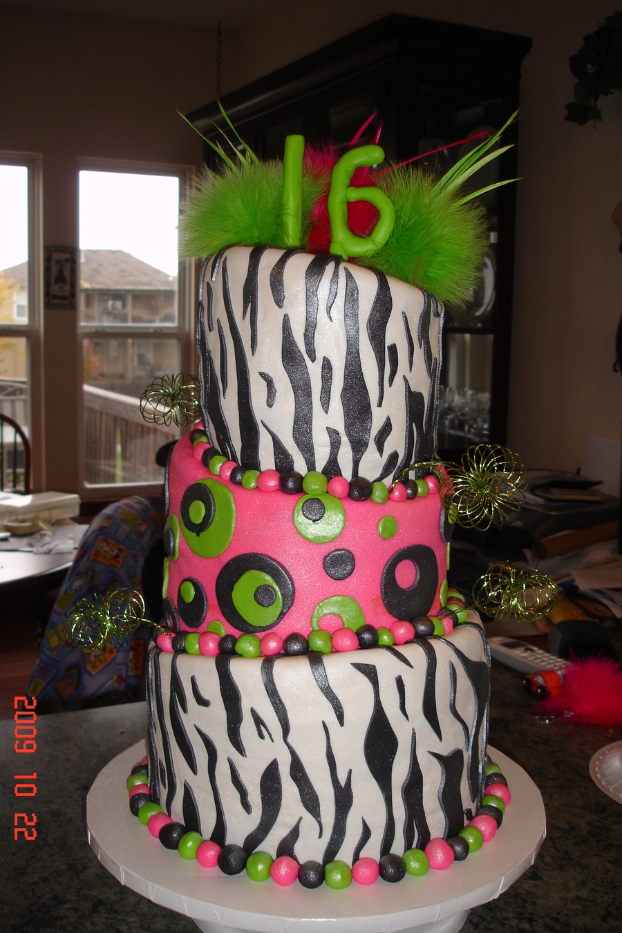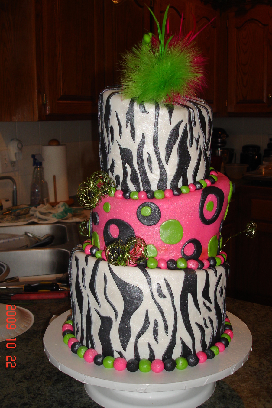 This was my first attempt at a topsy turvy. Everything was fine untill I tried to deliver the cake. We drove about 30 minutes and as we are turning into the venue the middle tier slides back and starts to break the base tier. I managed to get it inside the building and do a few adjustments. I just hope that after I left it didn't lose all it's integrity and fall over. I'll find out on Monday, the cake was for my bosses daughters birthday! =)