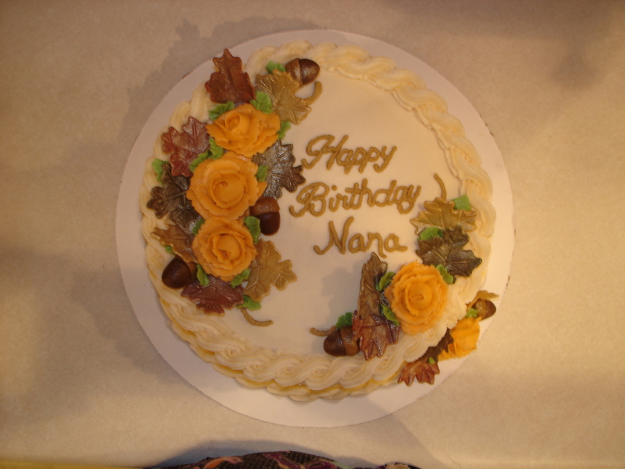 My first fall cake order. White chocolate buttercream icing and fondant leaves and acorns.
