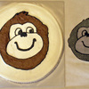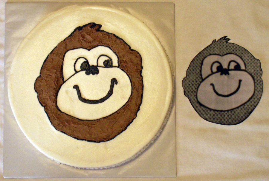 2 layer white 10" cake with white buttercream icing and chocolate buttercream freehanded monkey design. Design based on birthday invitation.