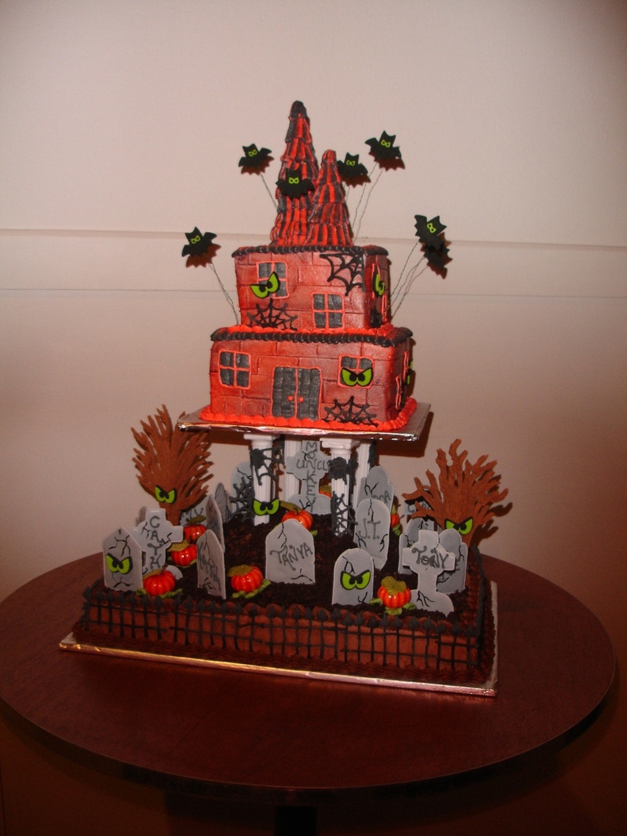 I made this cake for a melodrama play for their halloween show. Each actor has a tombstone in the graveyard with their name on it. The tombstones are made with color flow, the graveyard is covered with crushed oreos, the building is sprayed with Wilton's black and red food spray.
