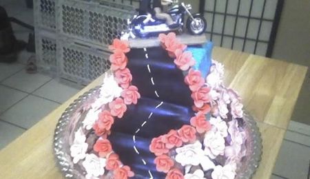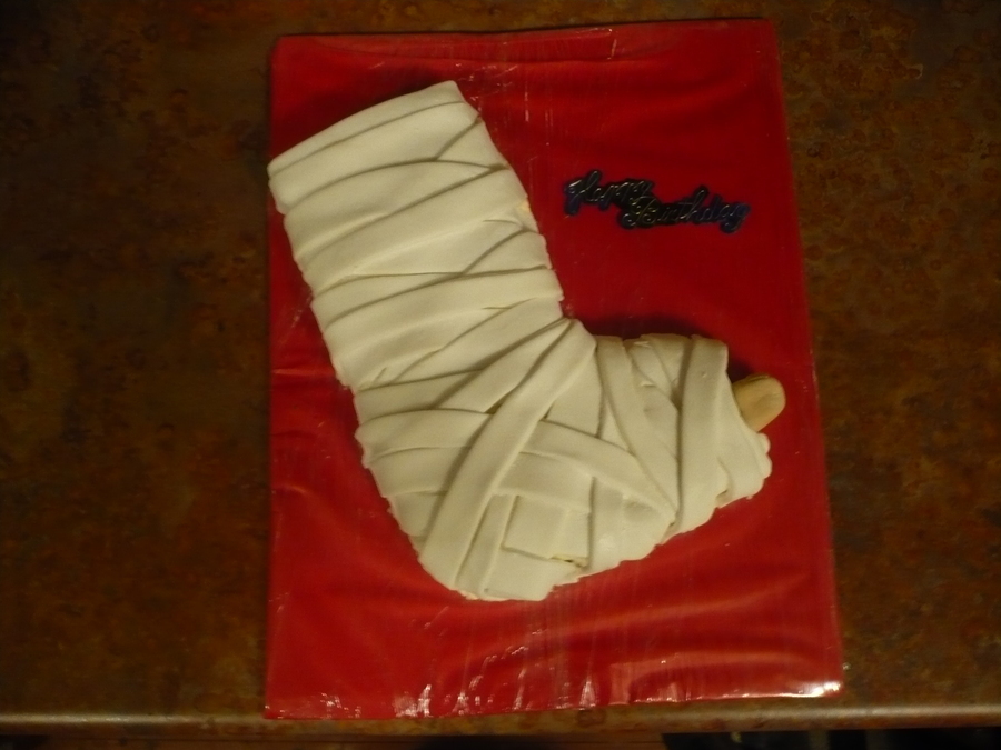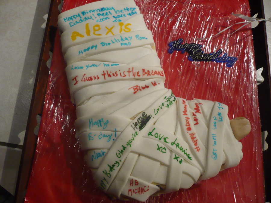My dad was in a motorcycle accident a couple of weeks before his birthday. He broke the whole right side of his body so I thought this cake would be very appropriate. The whole thing is decorated in MMF and everyone signed the cake with edible markers.