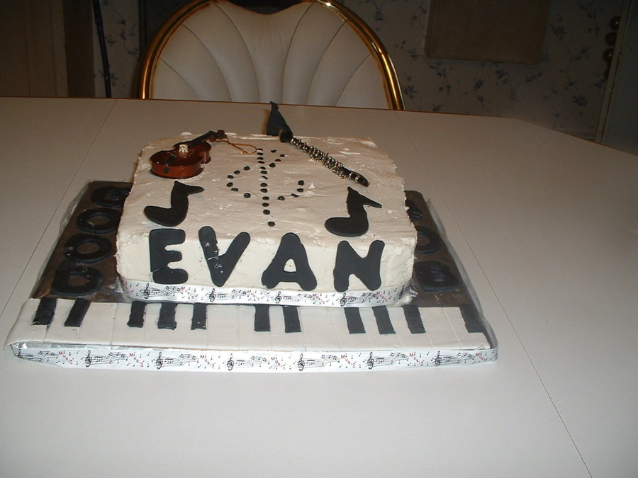 Fondant keyboard, chocolate notes with Christmas ornaments for violin and clarinet.