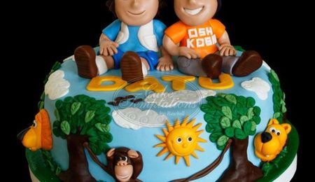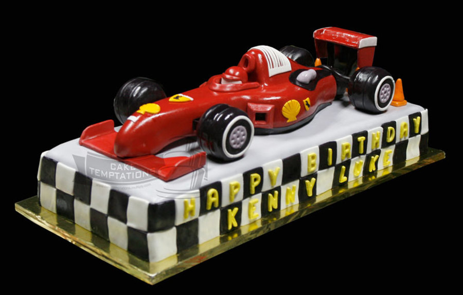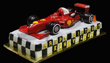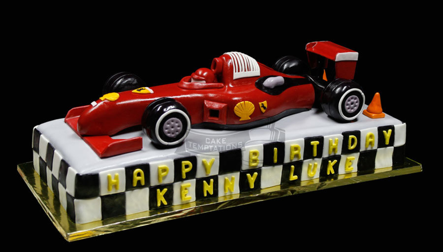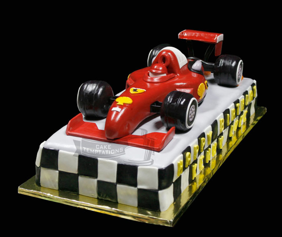 2ft. chocolate moist cake filled w/ chocolate fudge icing, mini marshmallows, walnuts and chocolate chips. F1 made of styro, hand sculpted and covered w/ fondant.
